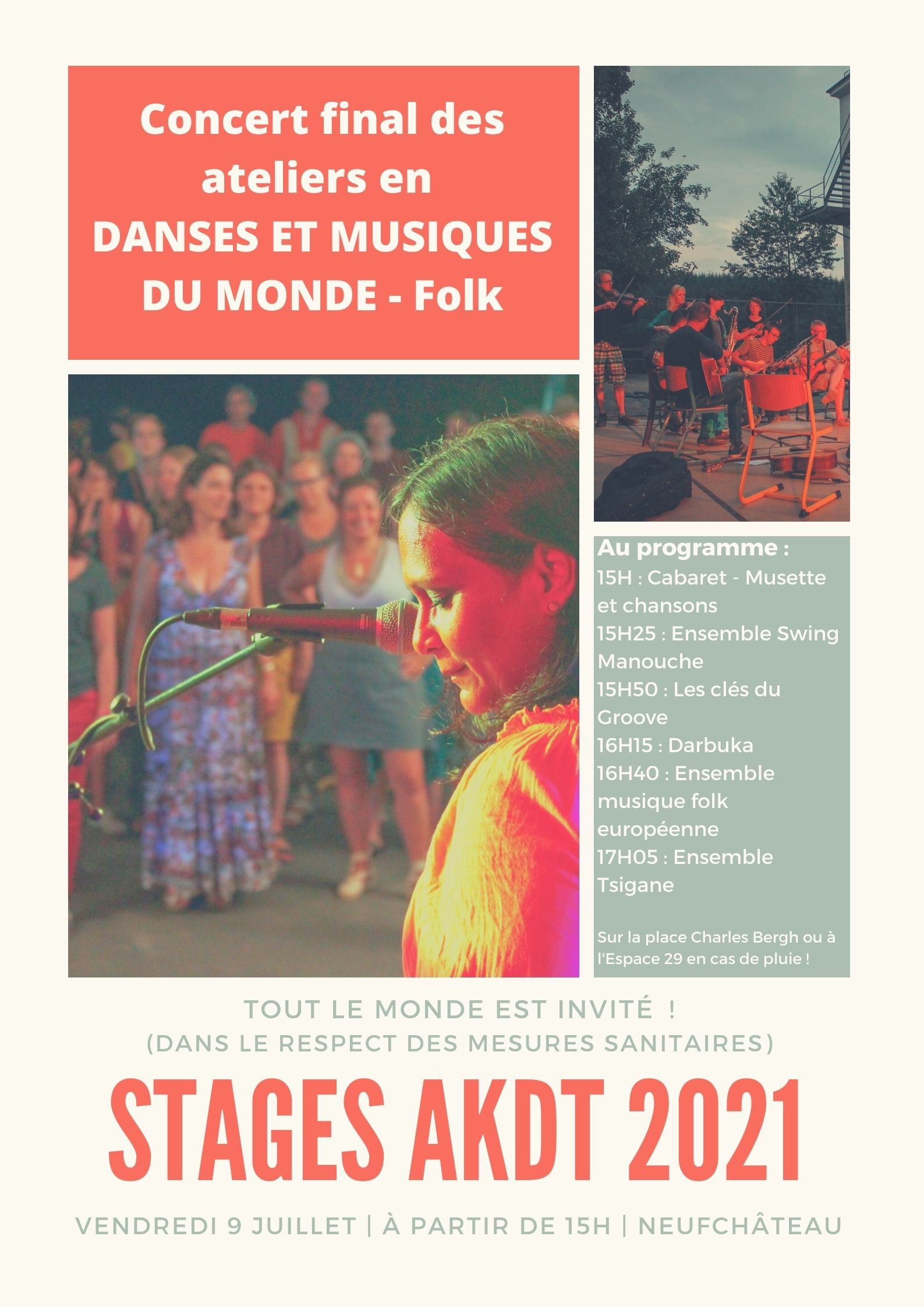 Sur la place Charles Bergh ou à l'Espace 29 en cas de pluie, les 6 groupes en Danses et musiques du monde vous joueront un petit concert de fin de stage de 15h à 17h30.
